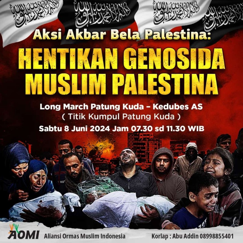 Aksi damai secara besar-besaran itu, kata Ustad Bachtiar Nasir LC. MM akan dilaksanakan pada 27 Juli 2024 dalam bentuk pawai semua jenis kendaraan darat, kendaraan laut dan kendaraan udara yang sudah terkonsolidasi dengan baik, ujarnya ketika memberi tausiah pada Jum’at, 31 Mei 2024 dalam persiapan aksi pada 1 Juni 2024 di Kedutaan Besar Amerika Serikat yang dinilai sebagai biang keladi perang di Palestina dengan Israel yang tidak kunjung selesai.