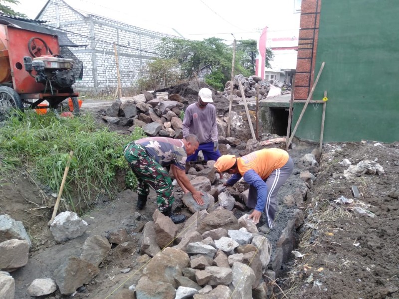 Foto : Sersan Dua Imam Sahudi, Babinsa Koramil 0817/08 Cerme, bersama warga melaksanakan kegiatan Kerja Bakti atau Karya Bhakti untuk pembangunan dinding penahan jalan dan saluran irigasi. (Dok. Pen0817)