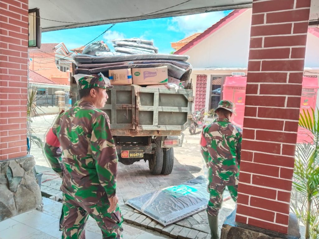 Serma I Gede Wilis anggota Koramil 0817/18 Tambak, menurunkan logistik bantuan relawan dari posko utama dan akan dikirim ke kantor Kecamatan untuk didistribusikan kepada warga masyarakat di Kecamatan Tambak.