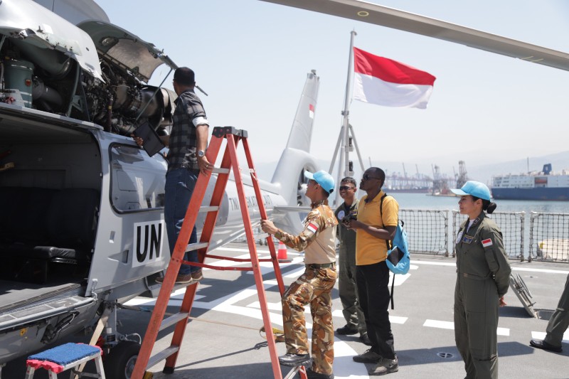 Foto : Tim inspeksi UNIFIL melakukan pemeriksaan teknis terhadap Helikopter Panther HS-1306 di atas KRI Sultan Iskandar Muda-367, Dermaga 4 Beirut, Lebanon (22/7/2025).