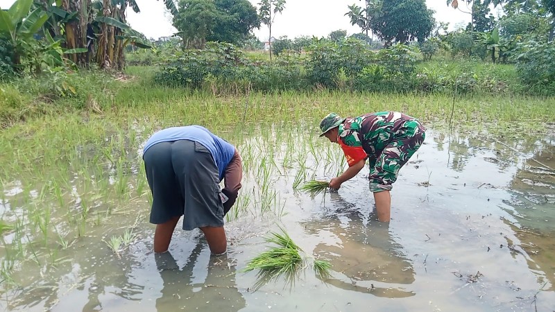 Pada pelaksanaannya kali ini, Babinsa membantu penanaman padi bersama warga masyarakat, harapannya dapat menumbuhkan semangat atau motivasi para petani binaan sehingga ketahan pangan di wilayah bisa sukses.