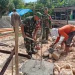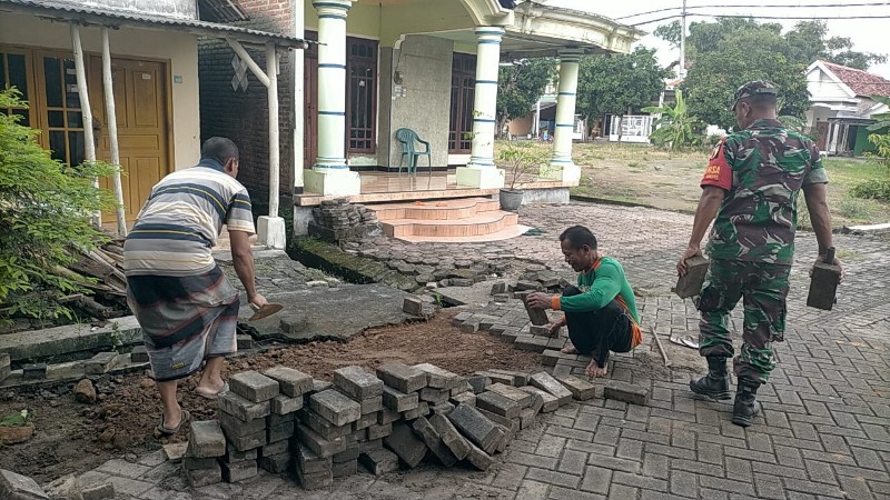 “Apabila pemasangan paving blok pada jalan dengan baik, disaat musim hujan air akan mudah terserap sehingga dapat membantu perawatan jalan dan bisa menjaga persediaan air di dalam tanah,”ucap Sertu Hadi sambil membantu dalam pemasangan paving blok.