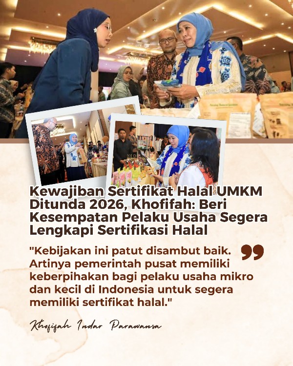 “Maka bagi pelaku usaha mikro dan kecil Jatim mari manfaatkan kesempatan ini untuk segera mengurus dan melengkapi sertifikat halal produknya,” imbuh wanita yang juga Ketum PP Muslimat NU ini.