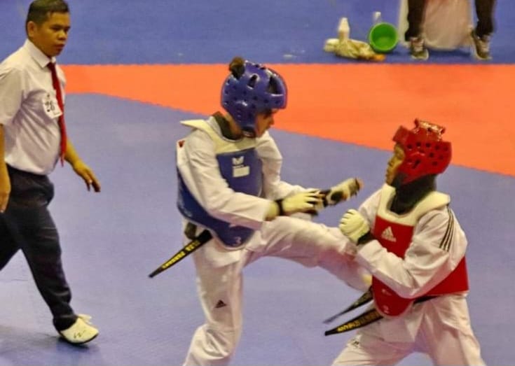 Serda Nav/W Elza Farhan, memakai rompi pengaman merah saat bertanding Kejurnas Taekwondo Kapolri Cup 2024 dan menyabet satu medali emas, Juara 1 Kategori Kyorugi Fest TNI-POLRI