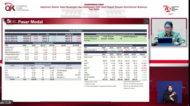 Di pasar saham, IHSG menguat 2,72 persen pada 31 Juli 2024, mencapai level 7.255,76 (terkoreksi 0,23 persen sepanjang tahun), dengan kapitalisasi pasar sebesar Rp12.338 triliun, naik 1,83 persen sepanjang bulan (5,76 persen sepanjang tahun).
