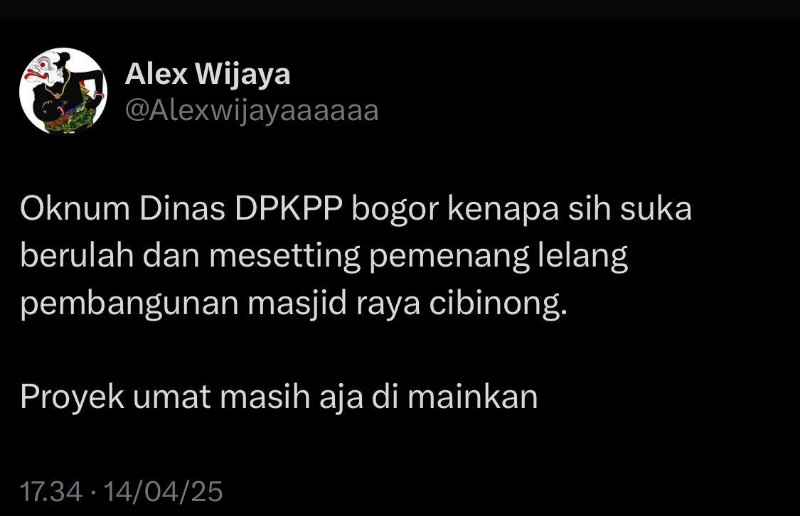 Menurut cuitan akun X (Twitter), @alexwijayaaaaaa bahwa, ada pengaturan pemenang dalam proyek pembangunan masjid raya Cibinong yang disinyalir dilakukan oleh oknum Dinas Perumahan, Kawasan Permukiman dan Pertanahan (DPKPP) Kabupaten Bogor.