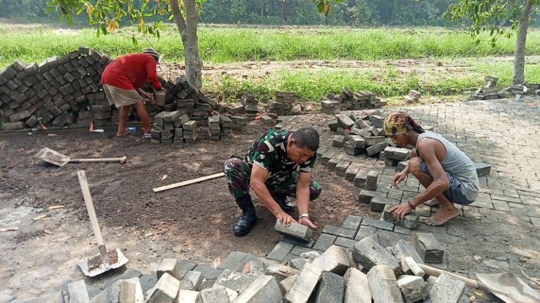 Babinsa Cerme Gotong Royong Perbaiki Jalan Desa Dooro