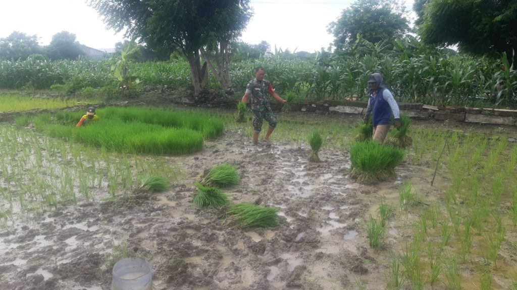 WARTA PERTIWI.COM, GRESIK –Wujudkan swasembada pangan di wilayah, Serda Eko Babinsa Koramil 0817/04 Menganti terus melaksanakan pendampingan kepada petani binaan dalam mengelola lahan pertanian, membantu petani menanam padi bertempat di Desa Drancang, Kecamatan Menganti, Kabupaten Gresik, Rabu (24/1/2024).