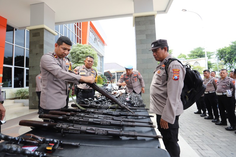 Pemeriksaan dilakukan terhadap puluhan senpi, baik senjata laras panjang maupun laras pendek. Proses pengecekan meliputi kondisi fisik, kebersihan senjata, hingga kelengkapan dokumen administrasi.